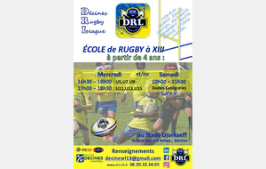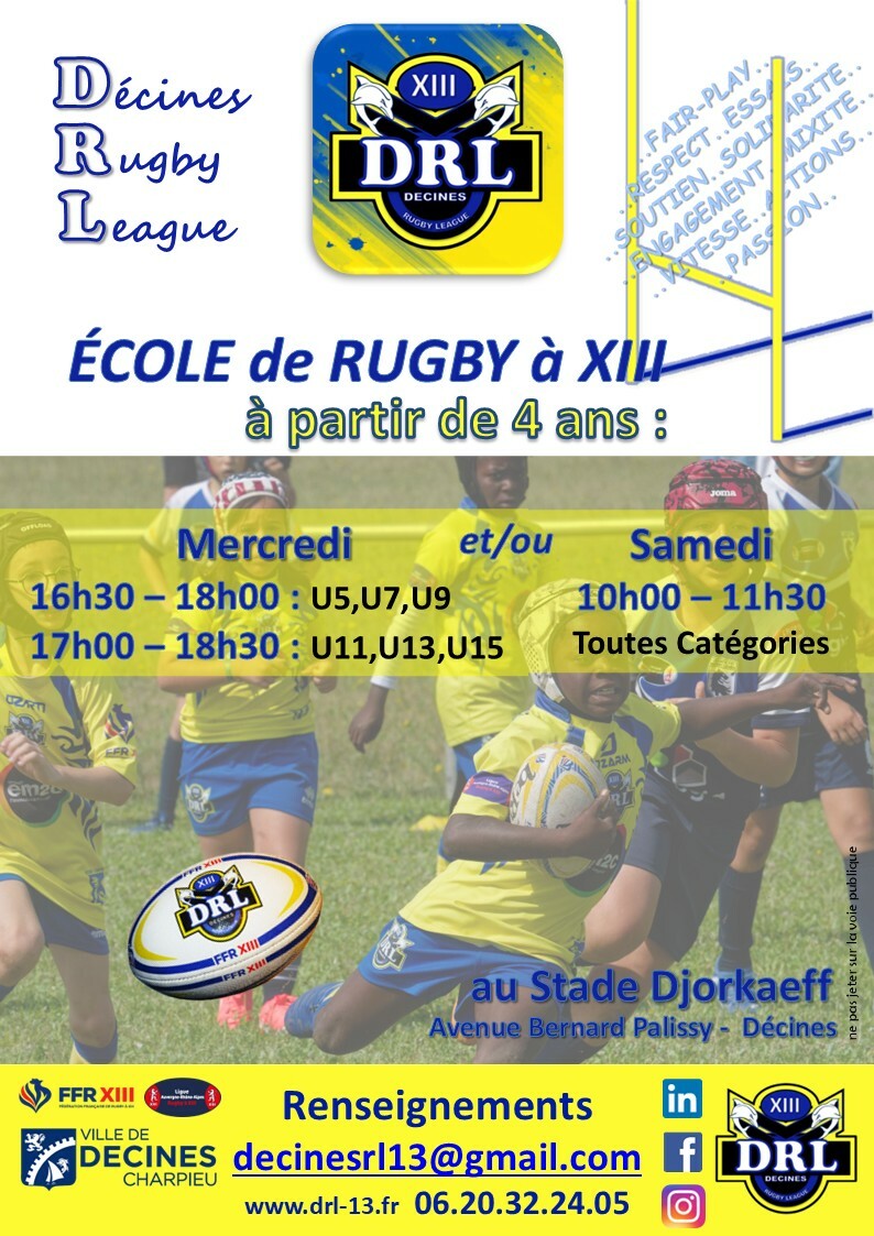 Samedi 13 septembre de 10h00 à 11h30 au Stade Djorkaeff, REPRISE de l'Ecole de Rugby du Samedi - Catégorie U5, U7, U9, U11, U13 et U15
