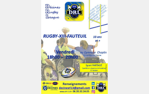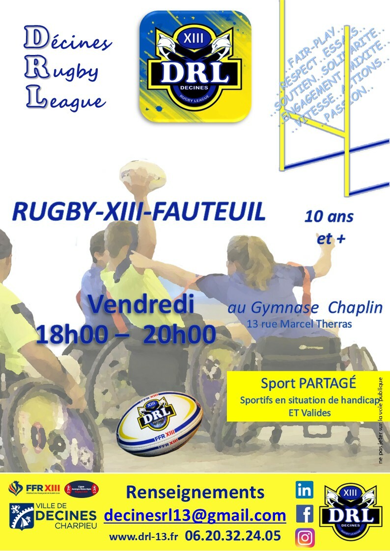 Vendredi 12 septembre de 18h00 à 20h00 au Gymnase Charlie Chaplin, REPRISE du Rugby-XIII-Fauteuil
