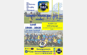 Lundi 8 septembre de 19h00 à 20h30 au Stade Djorkaeff, REPRISE du Touch XIII (Loisir)
